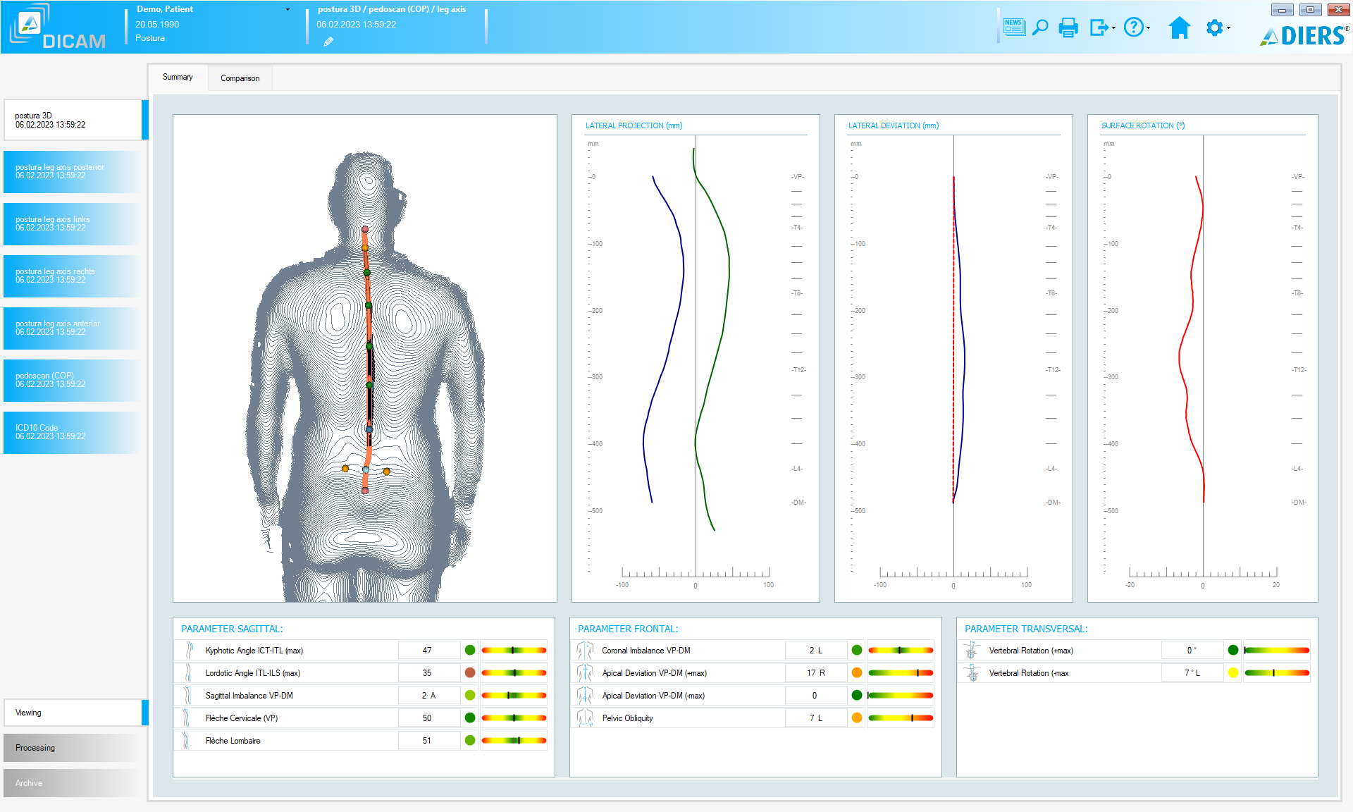 • 3D-Rekonstruktion der Mittellinie der Wirbelsäule, Protokoll für Frontal- und Seitenansicht und Informationen zur Wirbelsäulenrotation sowie zur Seitwärtsabweichung der Wirbelsäule, Beckenschiefstand usw.